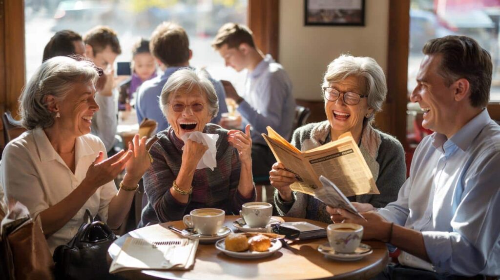Saturday morning at the café, the age gap hits you before the coffee does. On one side, a cluster of twenties and thirties, heads bowed, scrolling in perfect silence, thumbs moving faster than their eyes. On the other, a table of silver hair: someone telling a story with both hands, another laughing so hard she wipes away tears with a napkin, a folded newspaper passed around like a rare artifact.